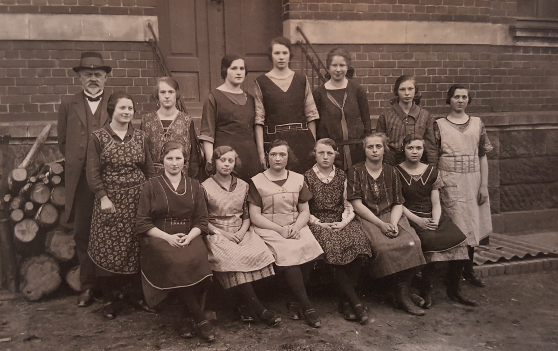 Eine Gruppe von älteren Mädchen, die nahezu alle eine Schürze tragen, steht vor dem Haupteingang der Schule, links von Ihnen der Kantor. Ganz links an die Hauswand gestapeltes Feuerholz.