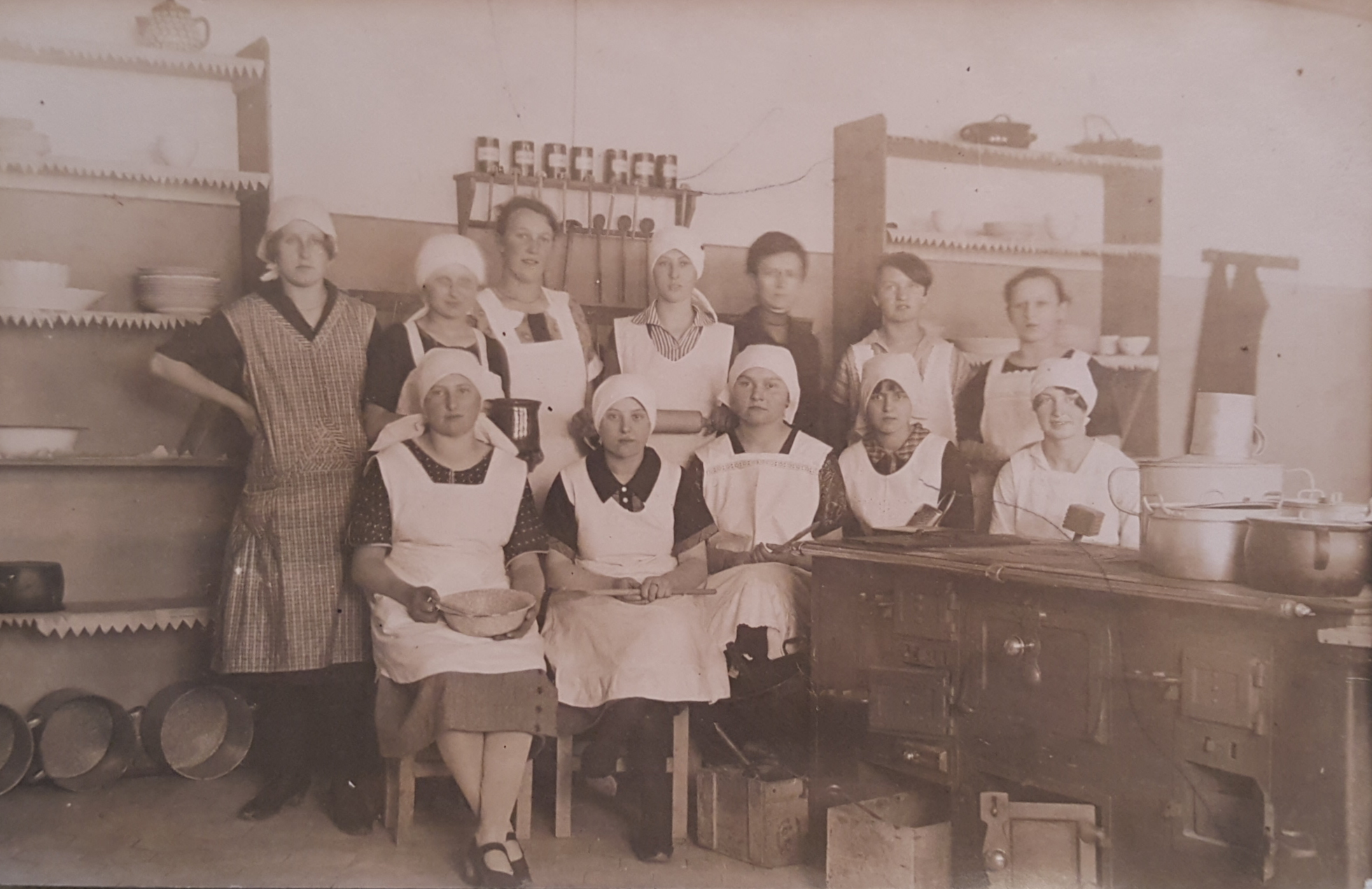 Eine Gruppe junger Frauen mit weißen Schürzen und Kopftüchern sowie Koch-Utensilien sitzt neben einem Herd mit großen Töpfen. Im Hintergrund REgale mit Töpfen, Schüsseln, Gewürzen und Kochlöffeln.