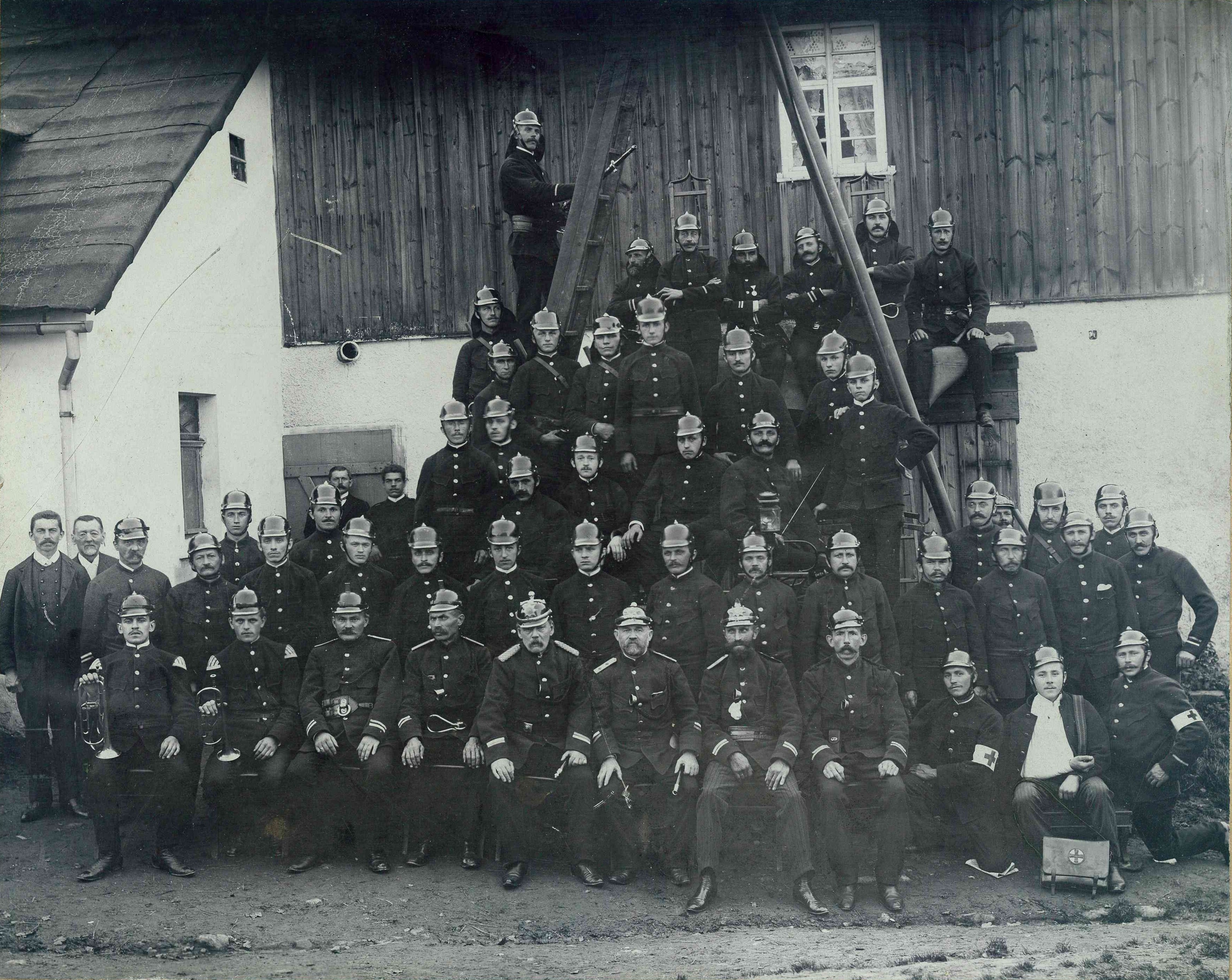 Gestelltes Bild der kompletten Feuerwehrmannschaft mit Sanitäter und Trompeter