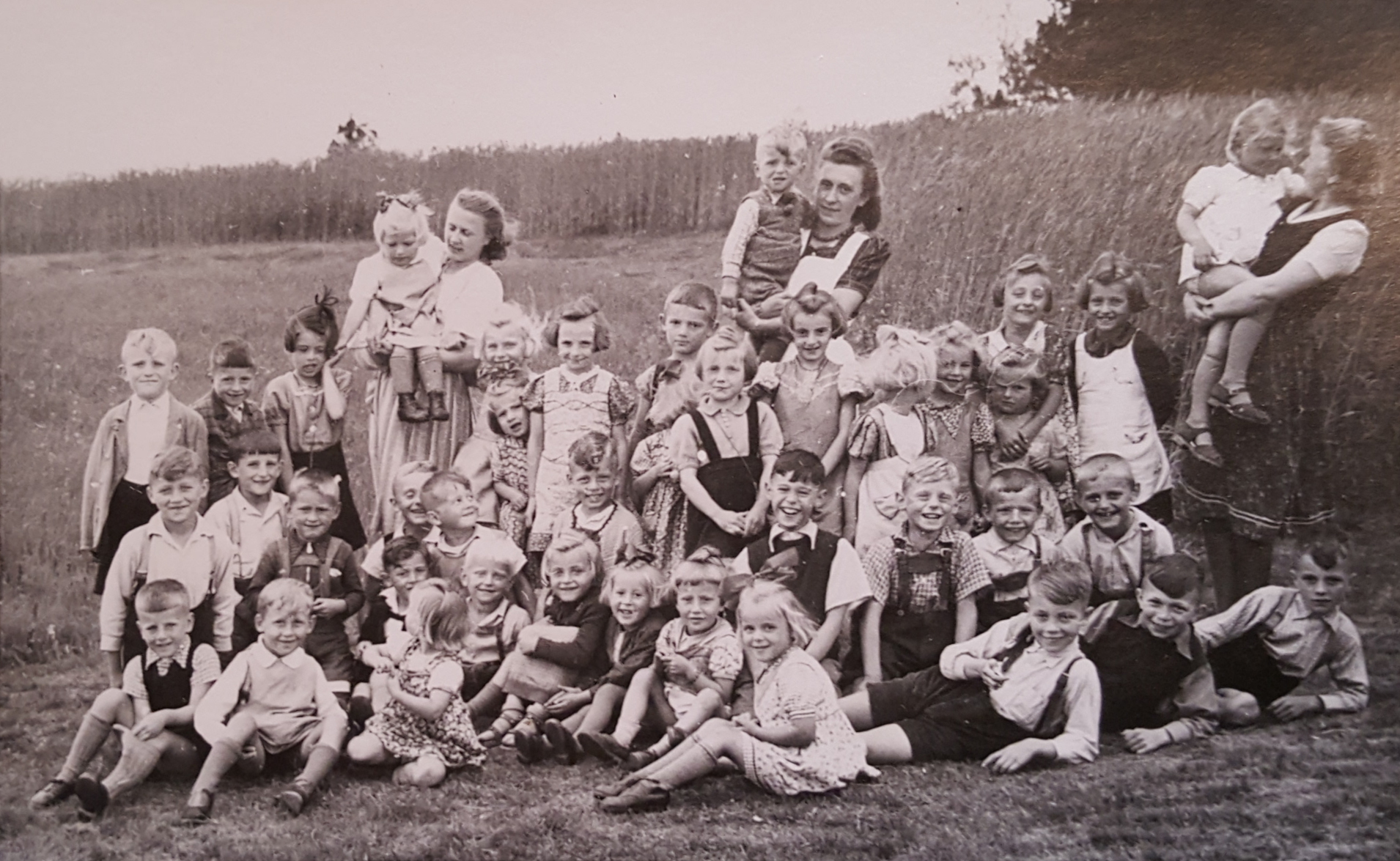Kindergartenkinder mit KIndergärtnerinnen auf einer Wiese neben einem Feld.
