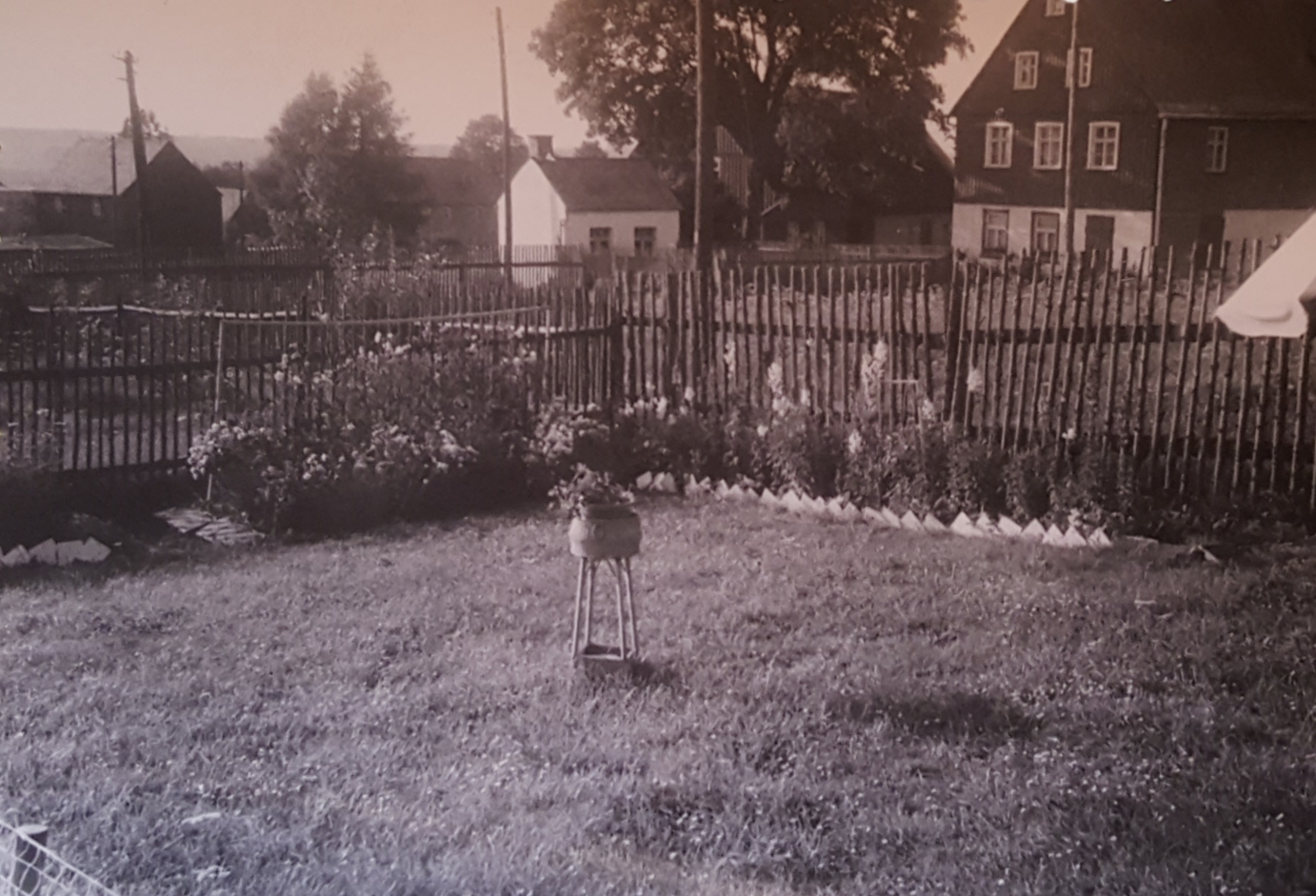Ein Garten mit Blumenbeeten und Holzzäunen mit Blick auf das Beckenhaus (rechts) und dessen Waschhaus (kleines, weißes Häuschen links)