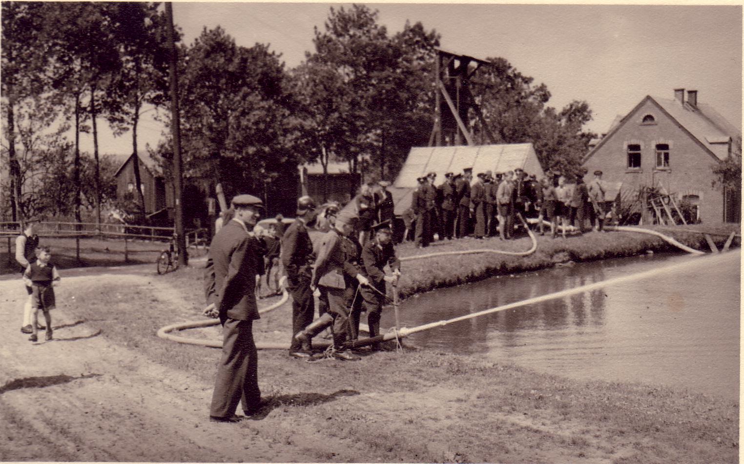 Feuerwehrübung am Schulteich, Einsatz der Motorspritze, im Hintergrund rechts Haus Rohrbacher Str. 18