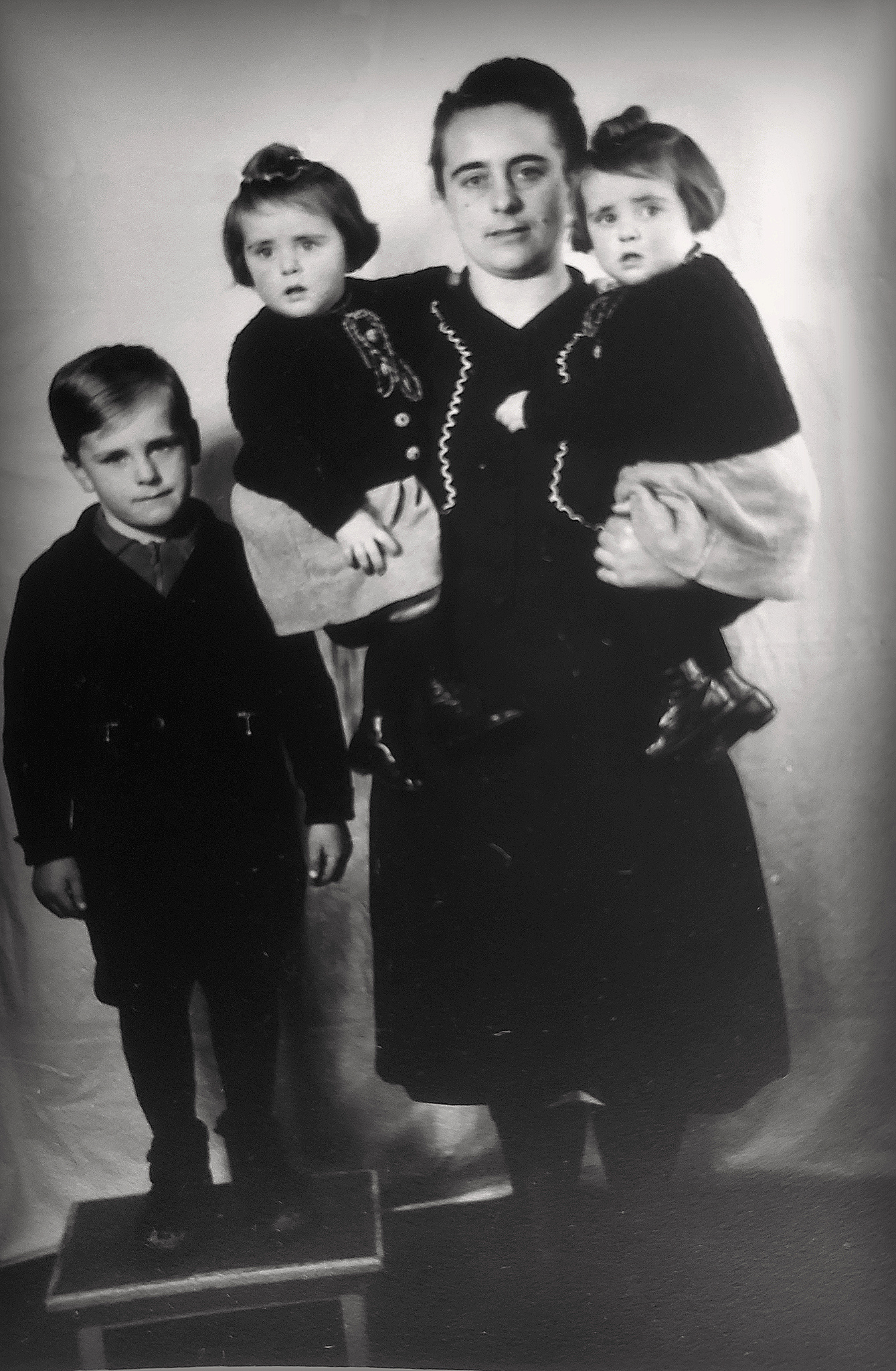 Die Wirtin Martha Adler mit den Zwillingen Christine und Ursula sowie auf einem Hocker Klaus.