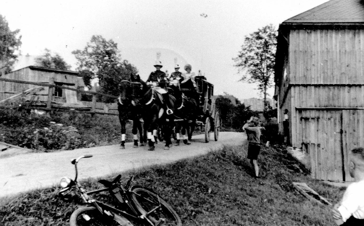 Eine der letzten Postkutschen verlässt das Dorf am Ortsausgang in Richtung Raun. Die Scheune rechts steht 2020 noch.
