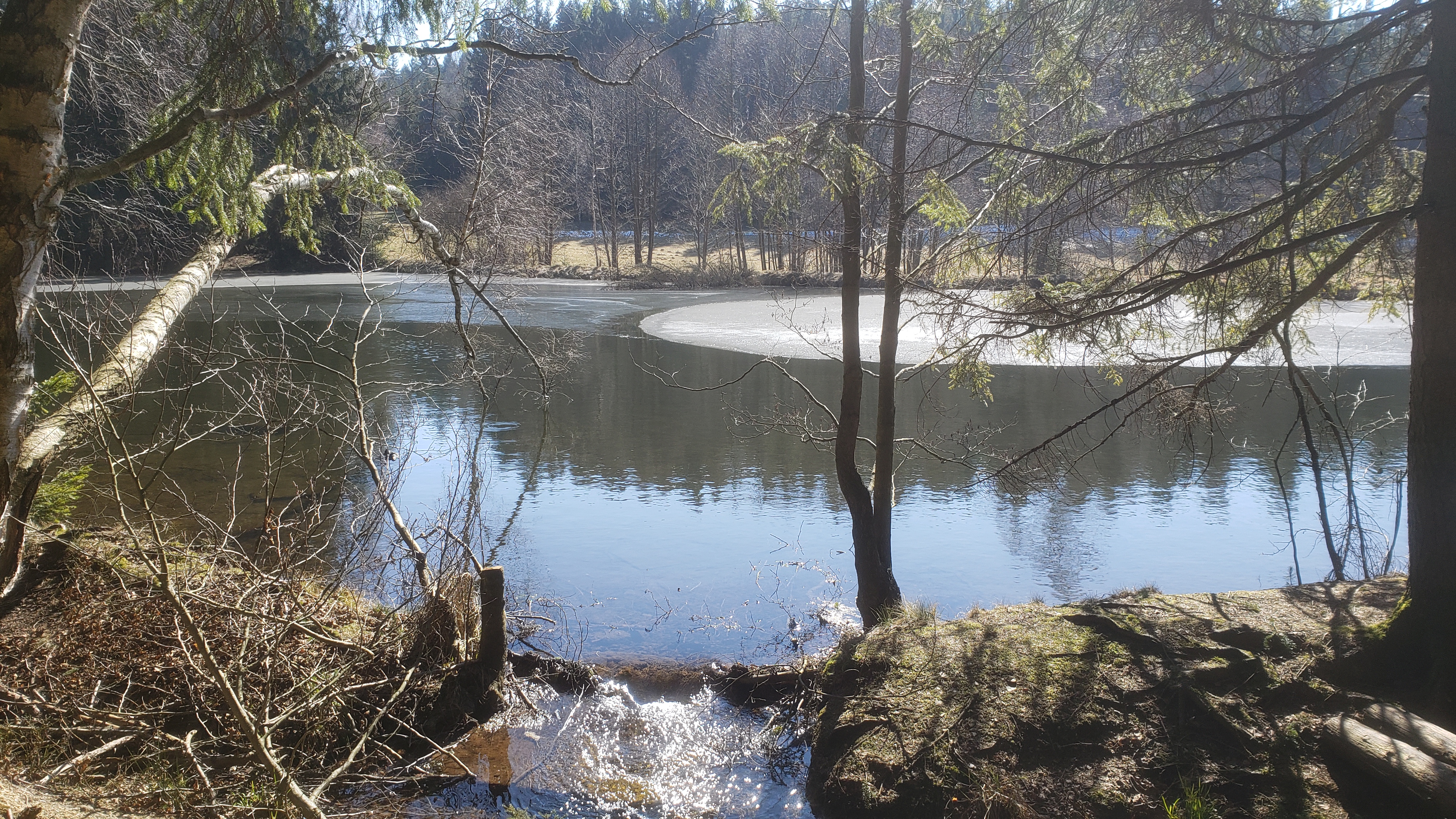 An einem sonnigen Frühlingstag ist der Überlauf des großen Haarmühlteiches, der zum Teil noch Eis bedeckt ist, zu sehen. Im Wasser spiegelt sich der Wald.