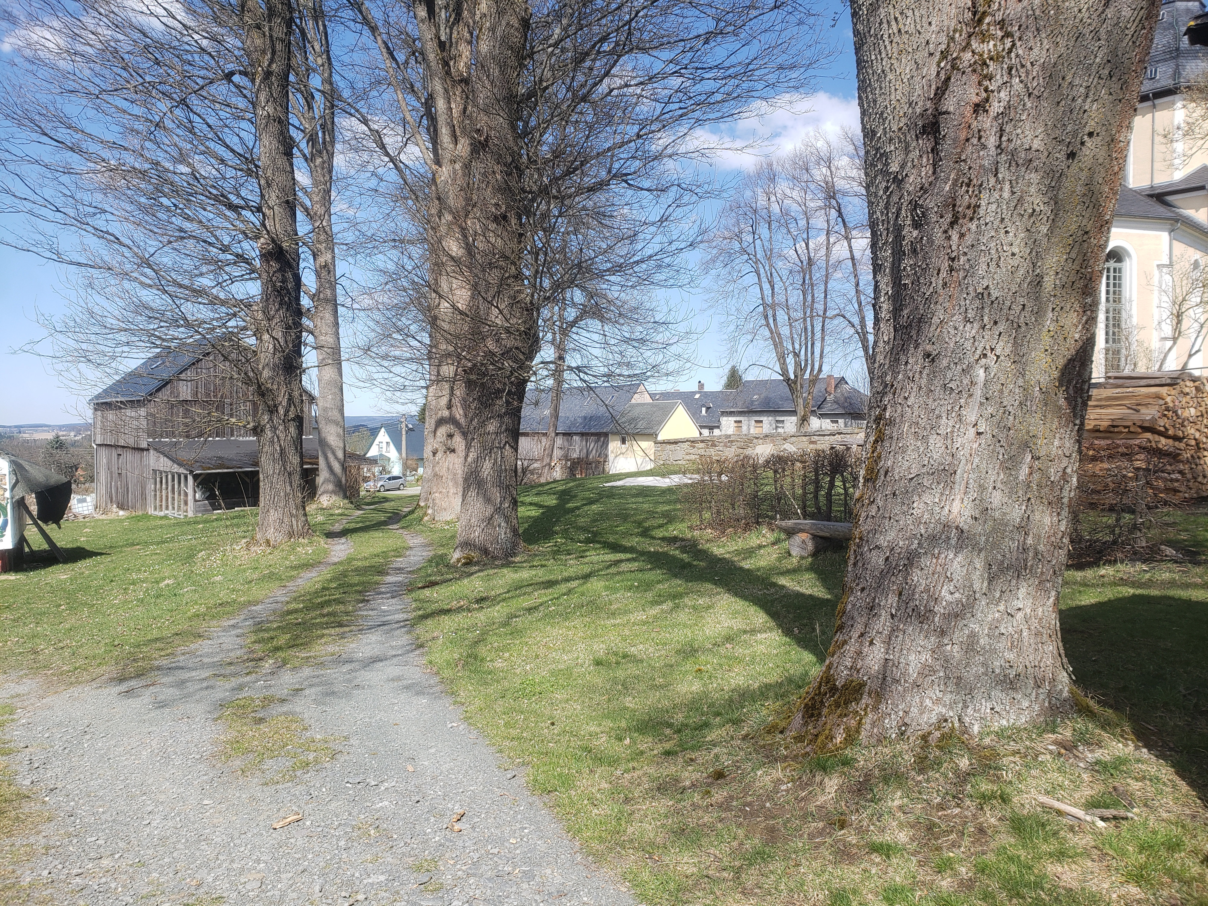 Die vom Pfarrer Schödel gepflanzten Eichen- und Ahornbäume stehen entlang des Weges, links die Pfarrscheune, rechts die Kirche.