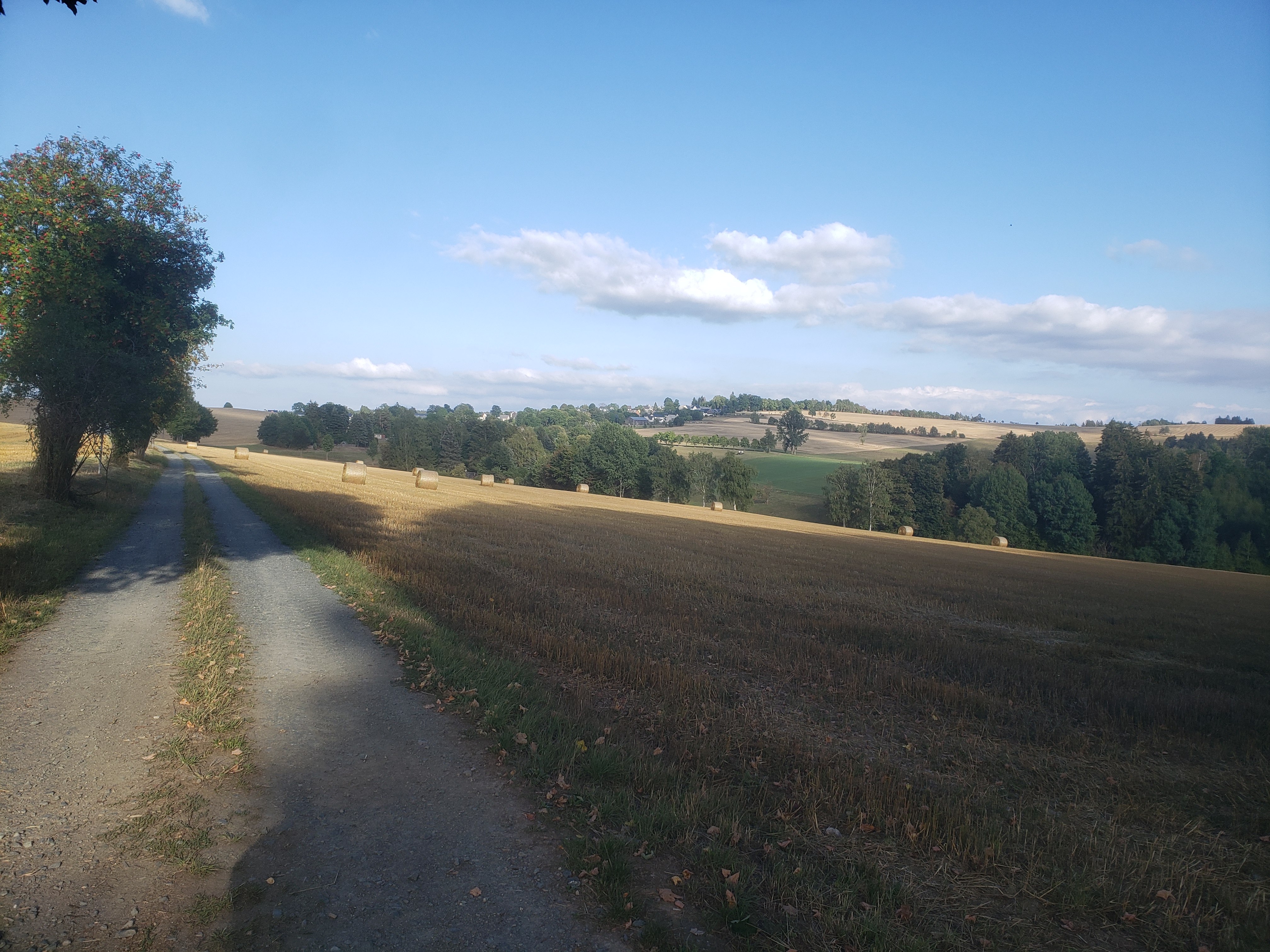 Blick über ein Feld mit Strohballen hin zum Dorf, dass sich auf dem Berg befindet, die Felder und der Kirchturm in der Mitte sind gut zu sehen.