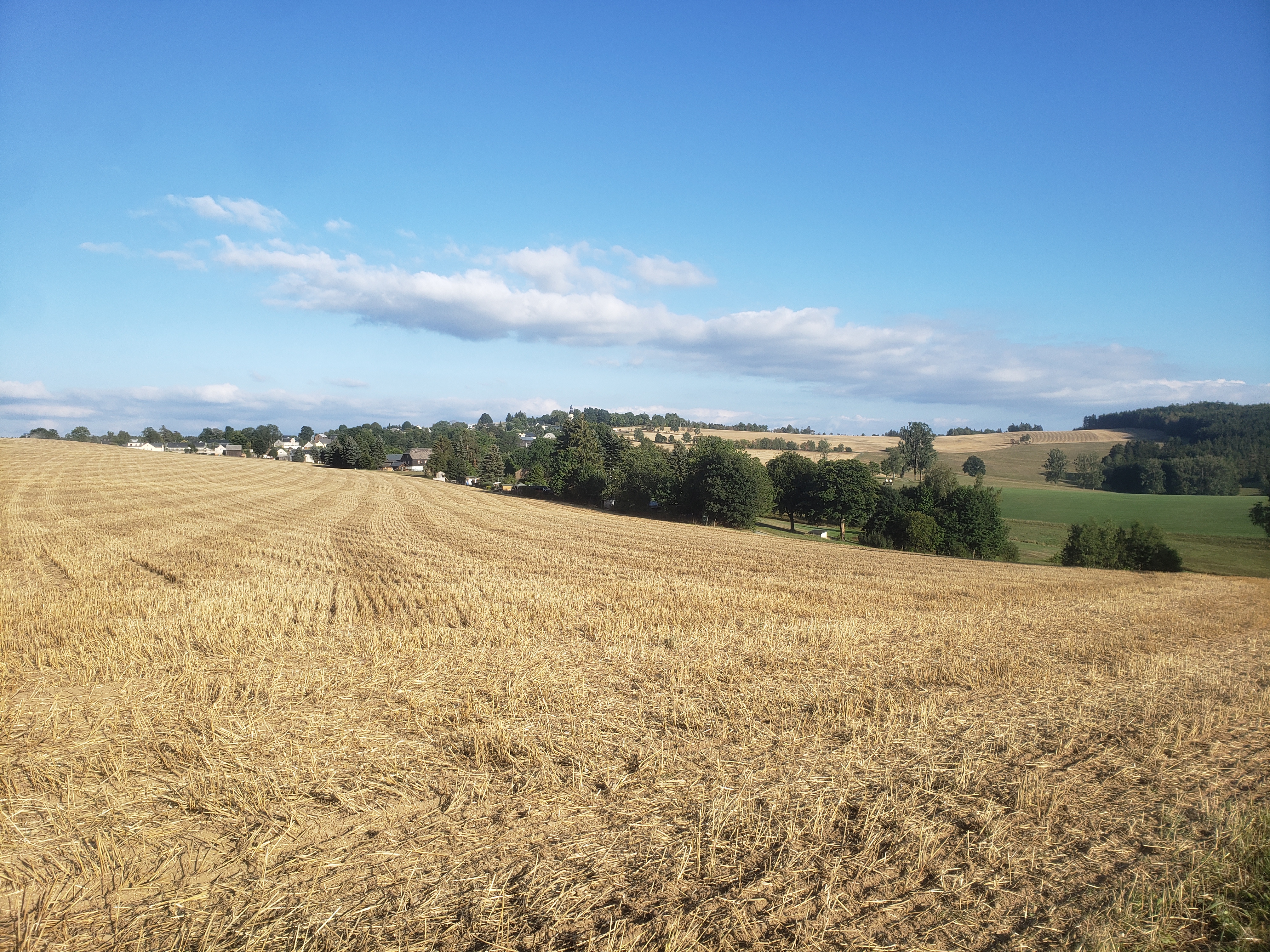 Das Dorf ist umgeben von abgeernteten Getreidefeldern.