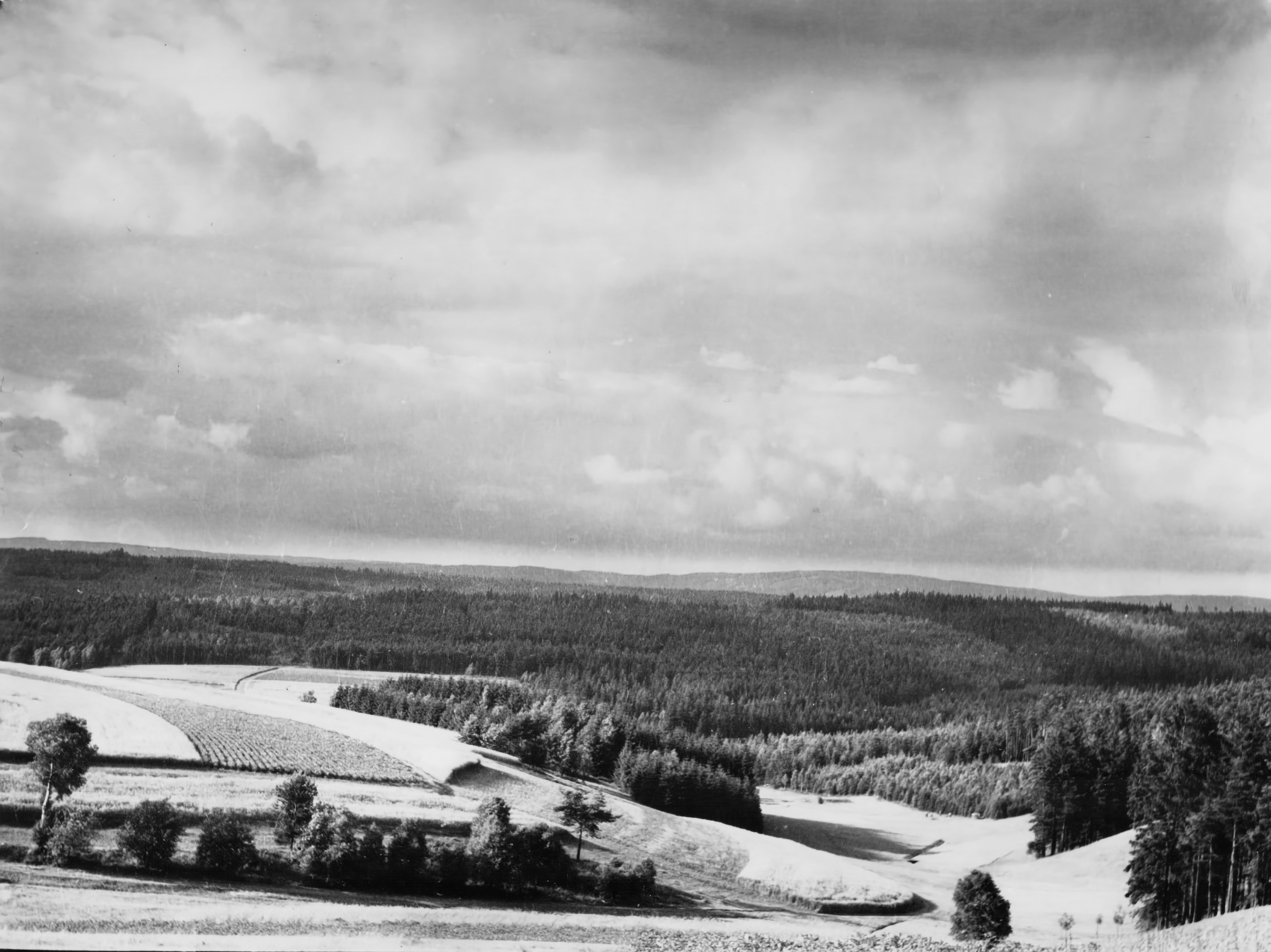 Im Vordergrund das Tal der Huhle, welches sich im Haarbachtal fortsetzt (rechts), ganz rechts Wellers Hopfen