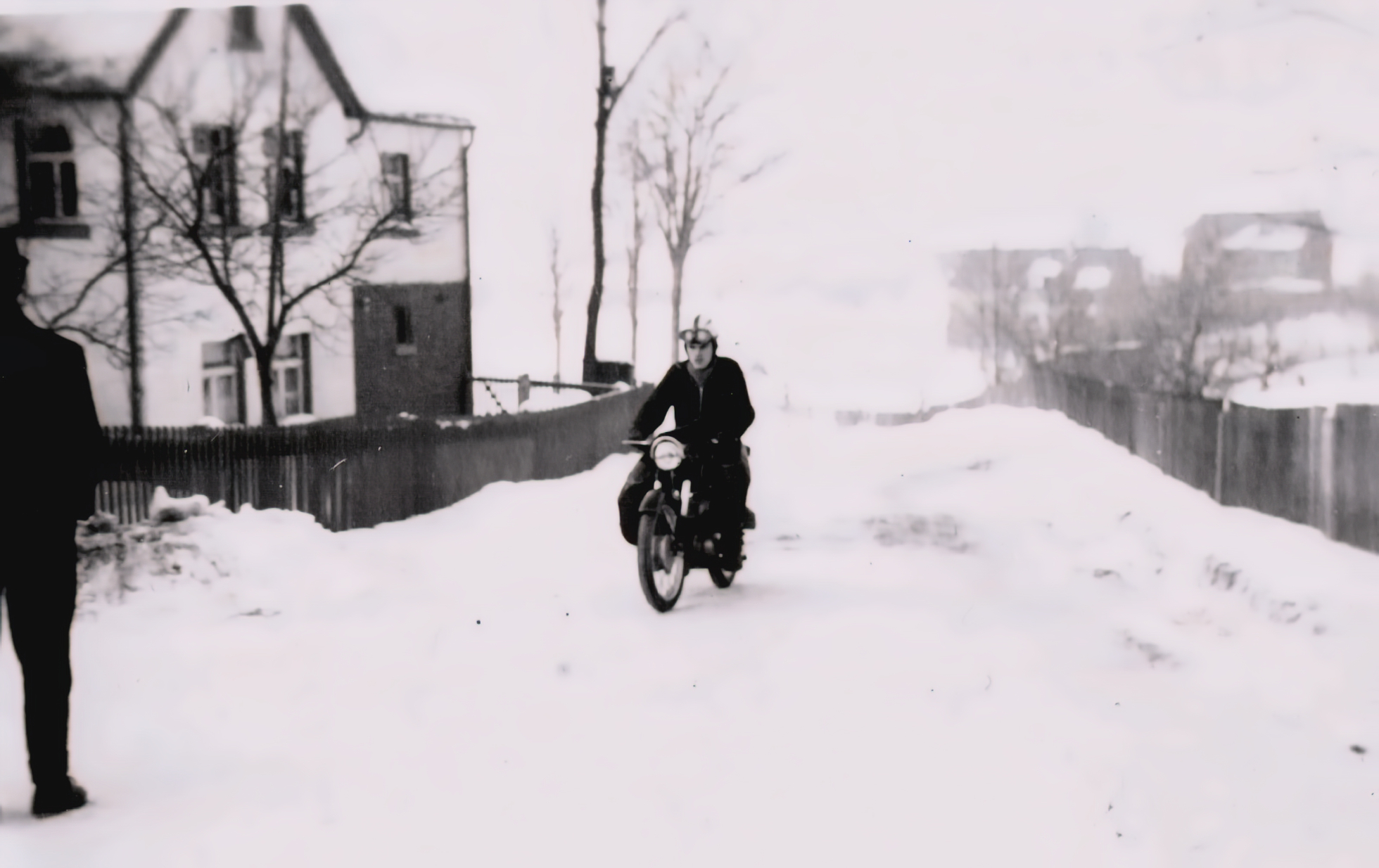 Ein Motorrad fährt auf der schneebedeckten Rohrbacher Straße vor einem heute zum Museum gehörenden Haus bergauf.