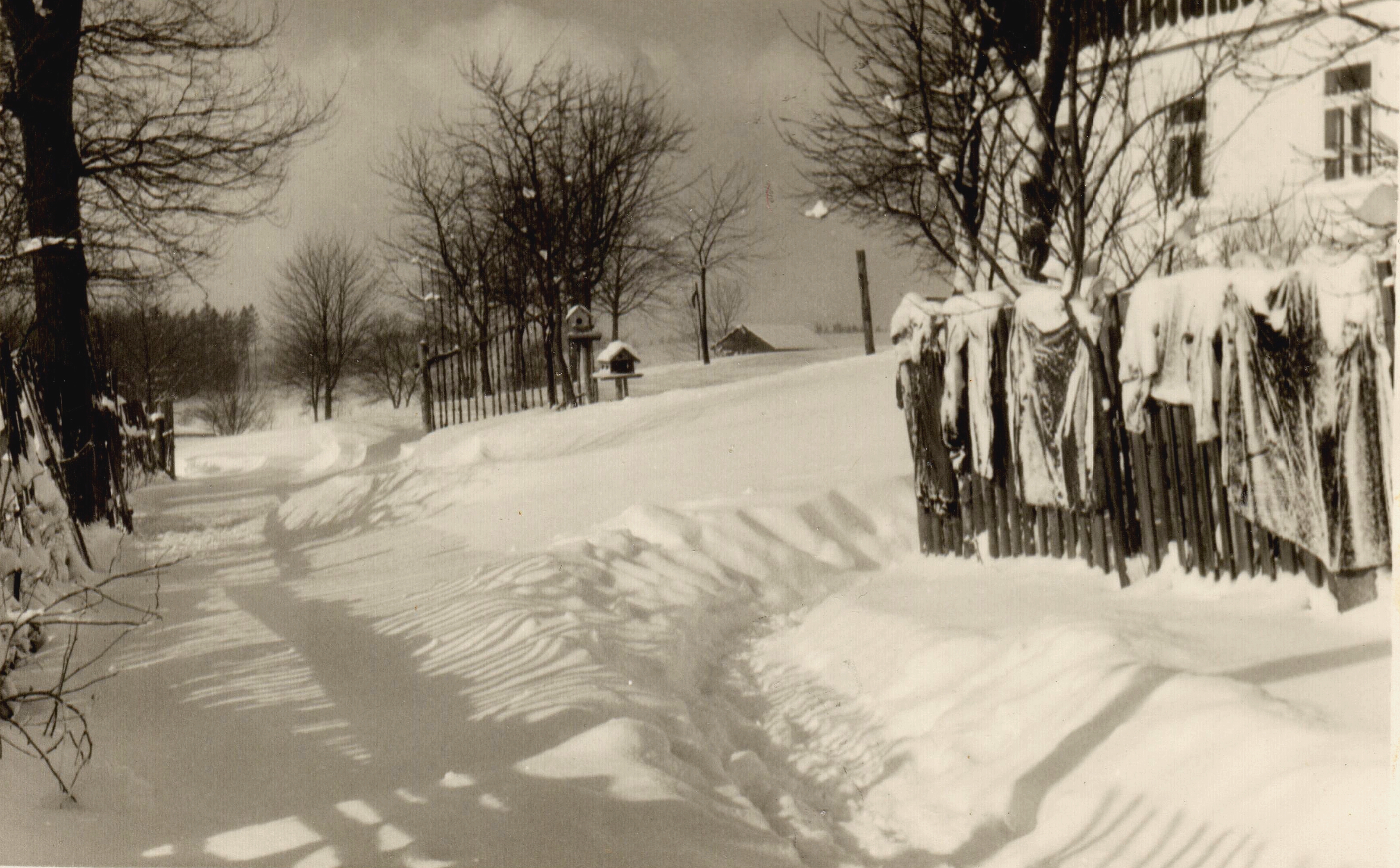 Zugewehte Straße im Winter, am Zaun wird Wäsche getrocknet.