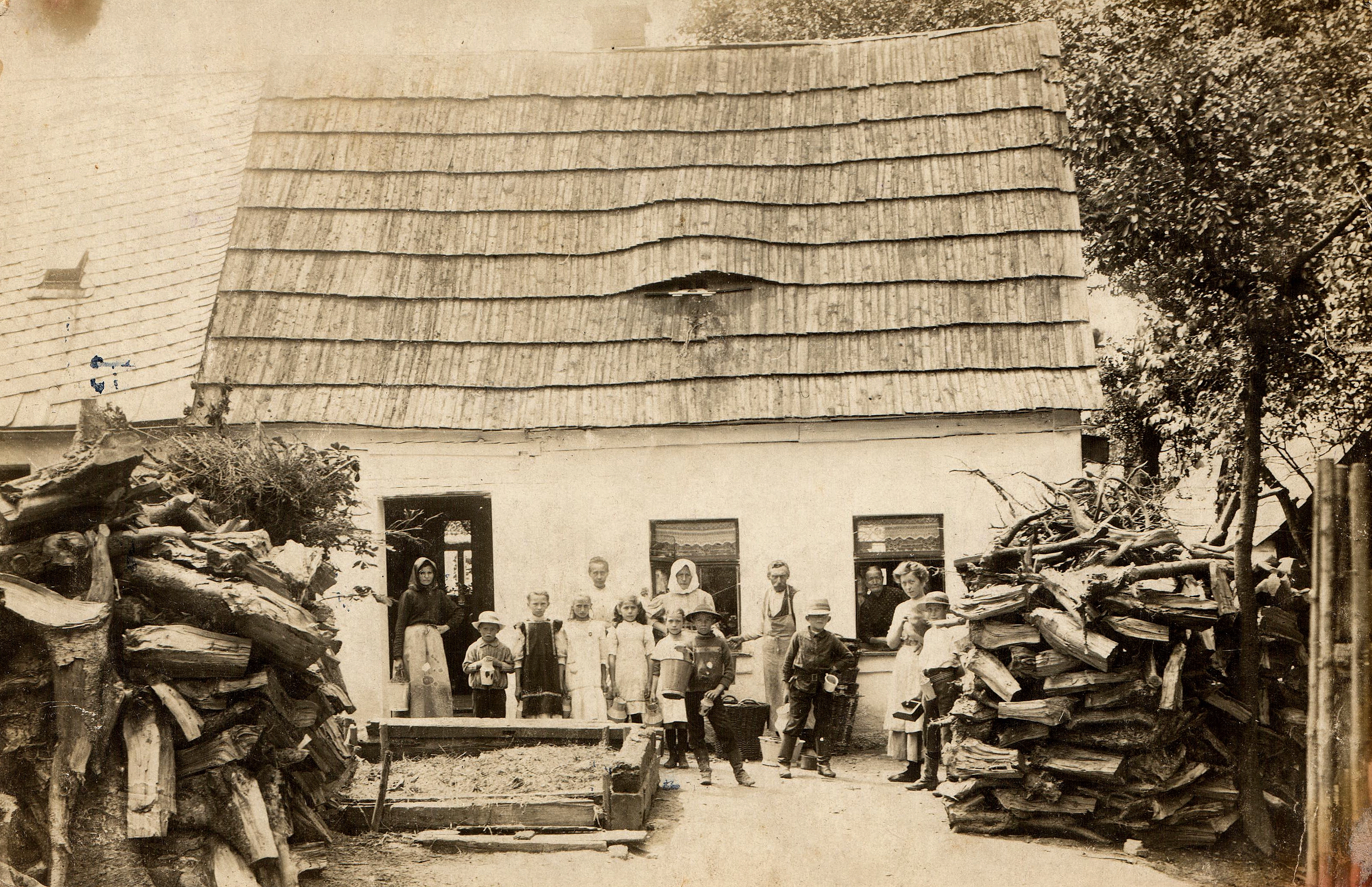 Die ganze Familie vor dem Pflücken, ausgestattet mit Krügen und Tüpfeln sowie dem Pflückrechen (rechts). Rechts und Links Berge von Brennholz zum Trocknen.