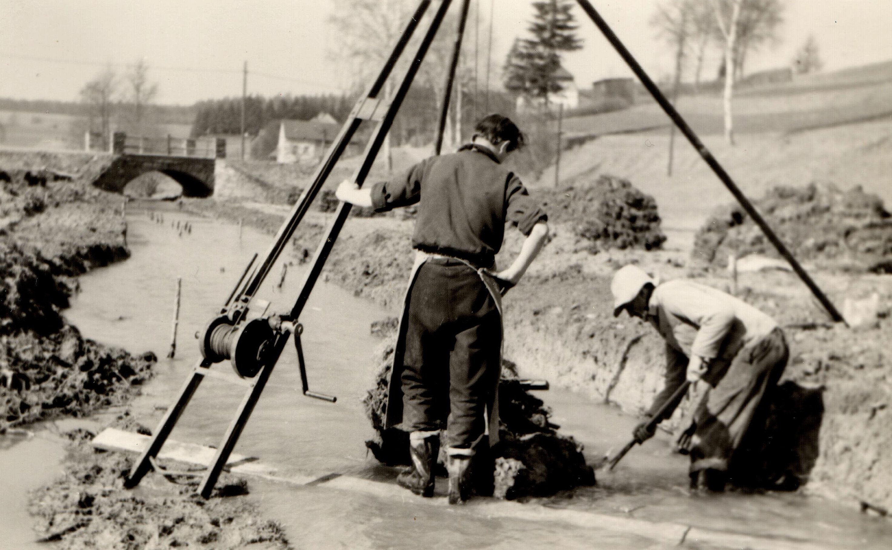Zwei Männer mit Flaschnenzug im Haarbach von Schönlind oberhalb der Straßenbrücke nach Landwüst