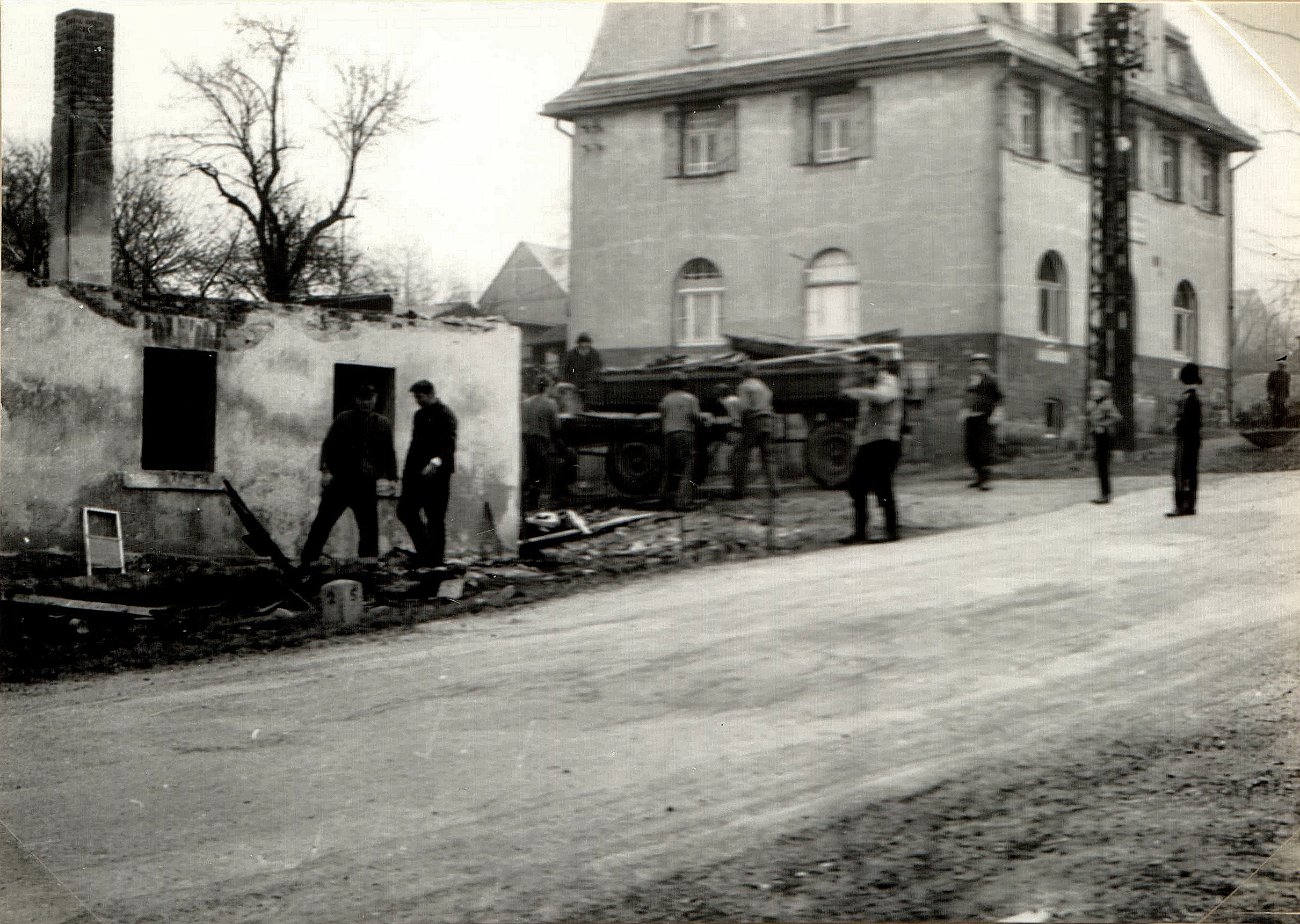 Fenster und Dachstuhl sind bereits entfernt und auf einen Hänger aufgeladen. Rechts im Hintergrund der Thüringer Hof, davor die nicht asphaltierte Rohrbacher Straße.