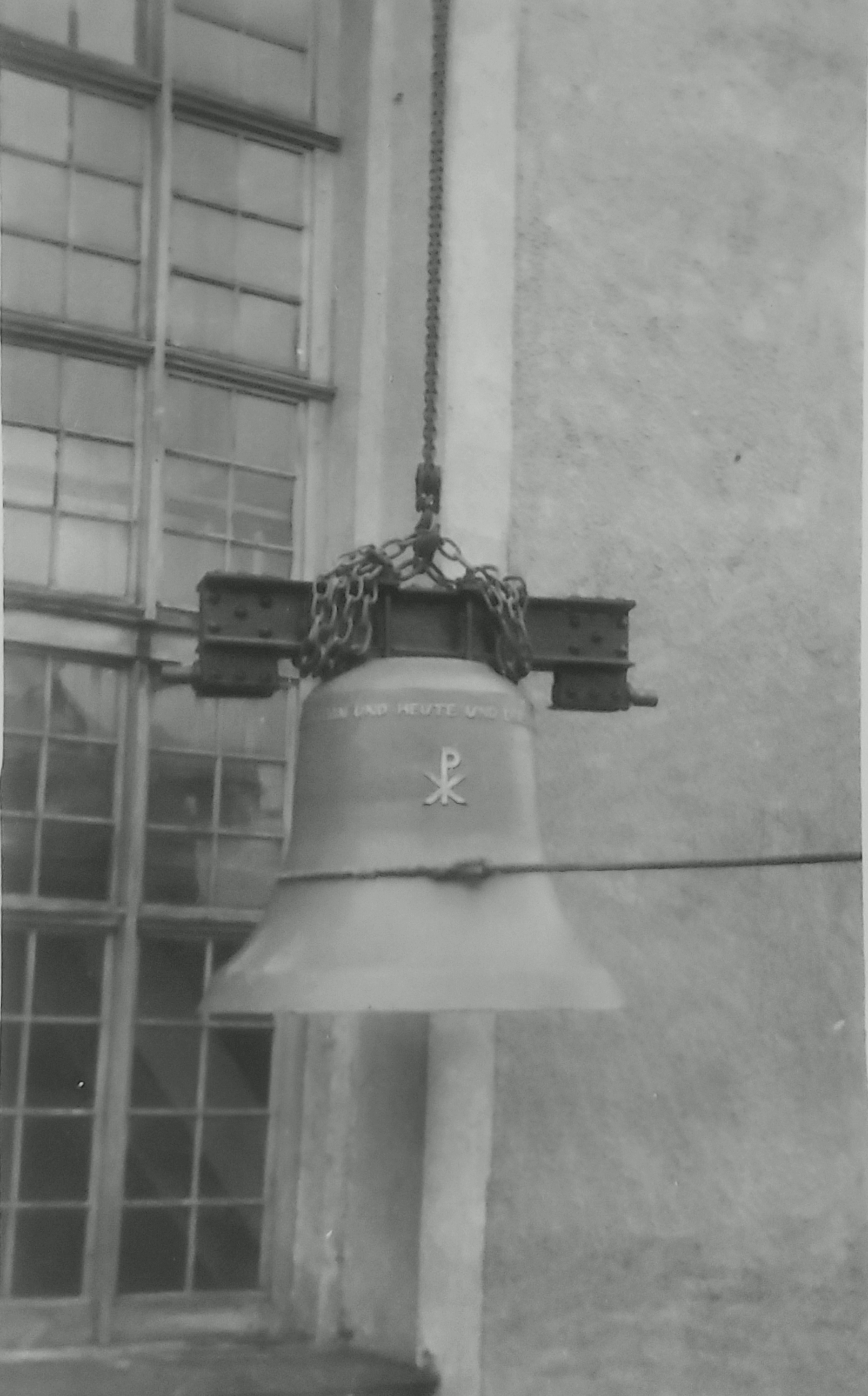 Am Seil wird die Glocke vor einem KIrchenfenster nach oben gezogen.