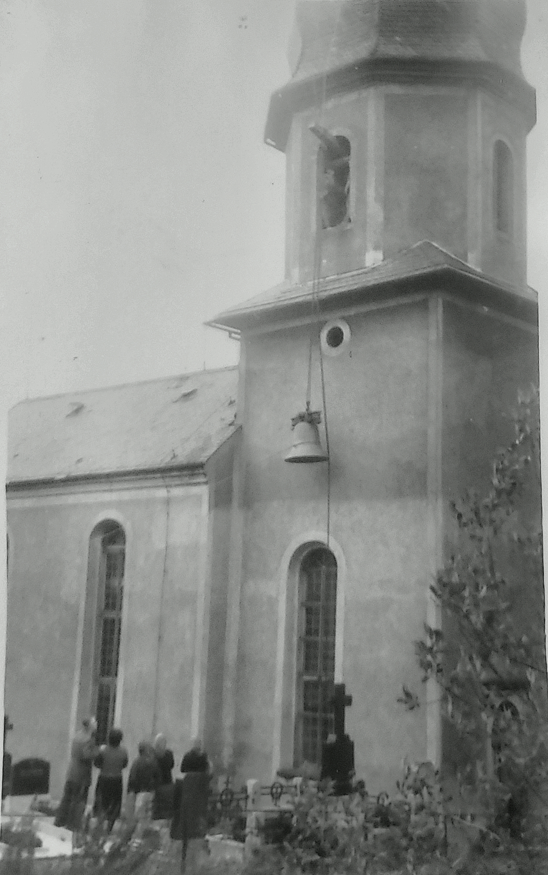Die an einem Seil hängende Glocke wird nach oben gezogen, Zuschauer verfolgen die Aktion vom Friedhof aus.
