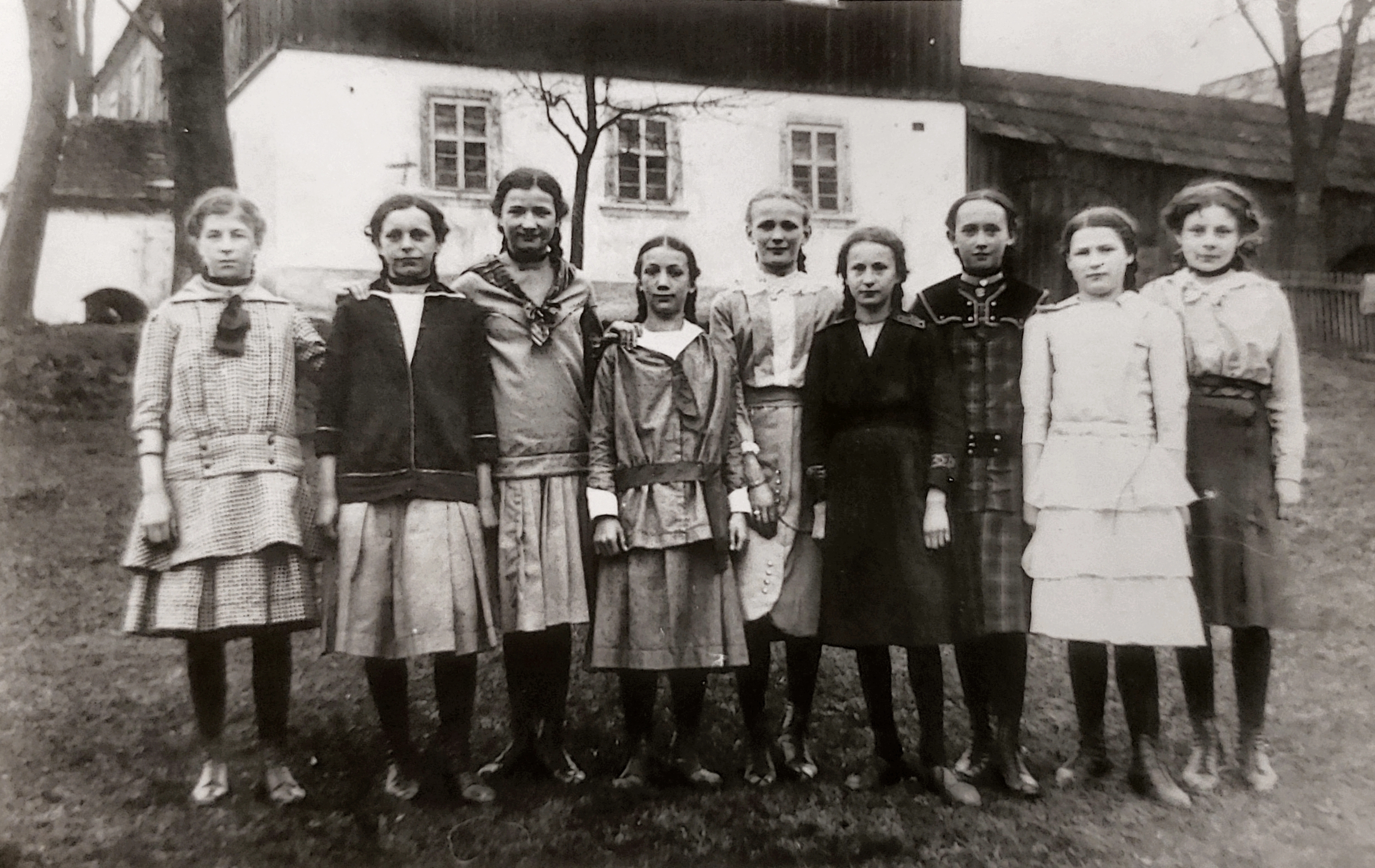 Eine Gruppe von Mädchen steht für ein Gruppenbild vor einem Haus.
