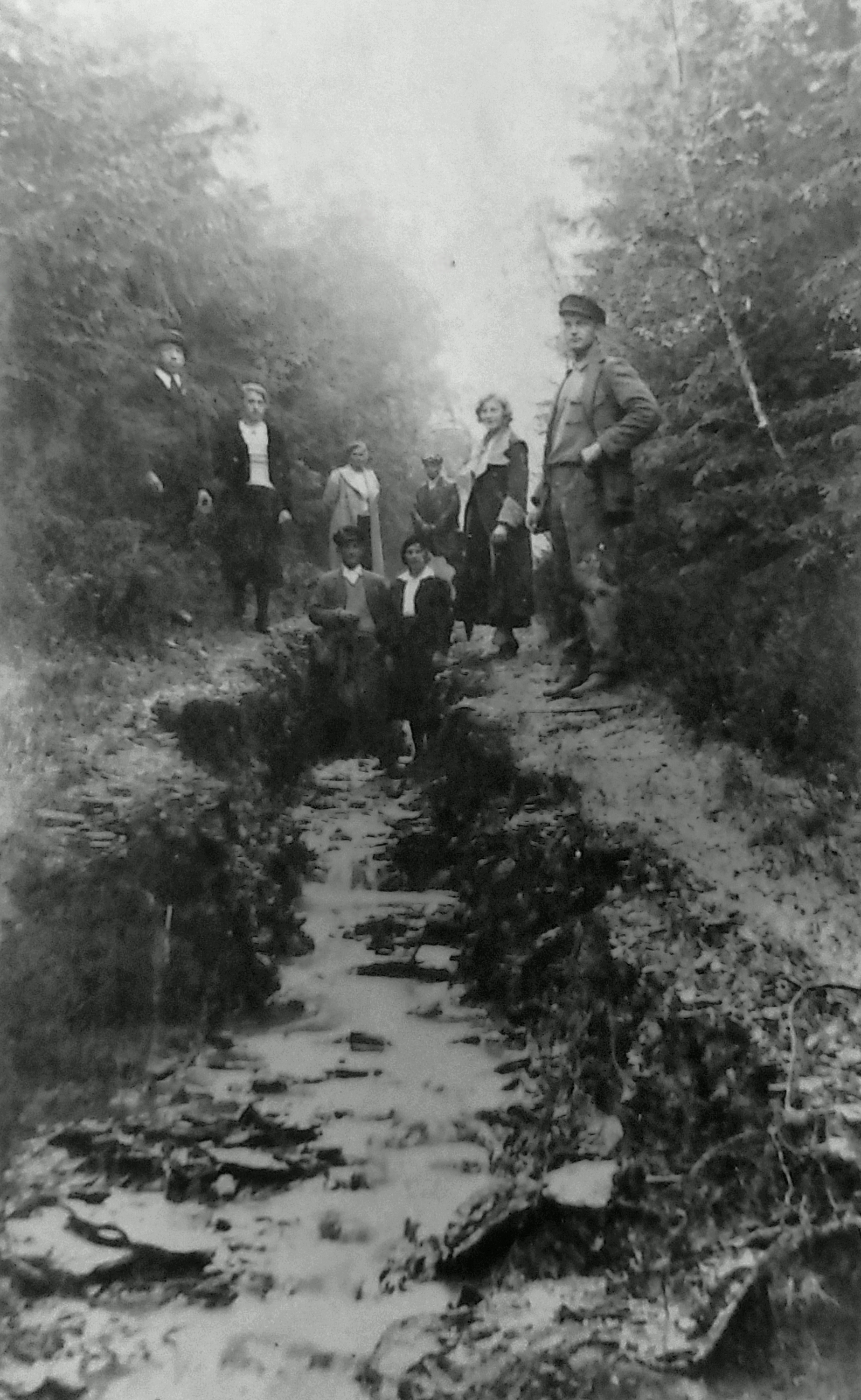 Nach dem Unwetter laufen festlich gekleidete Personen auf dem tief weggeschwemmter Weg nach Dürrngrün.