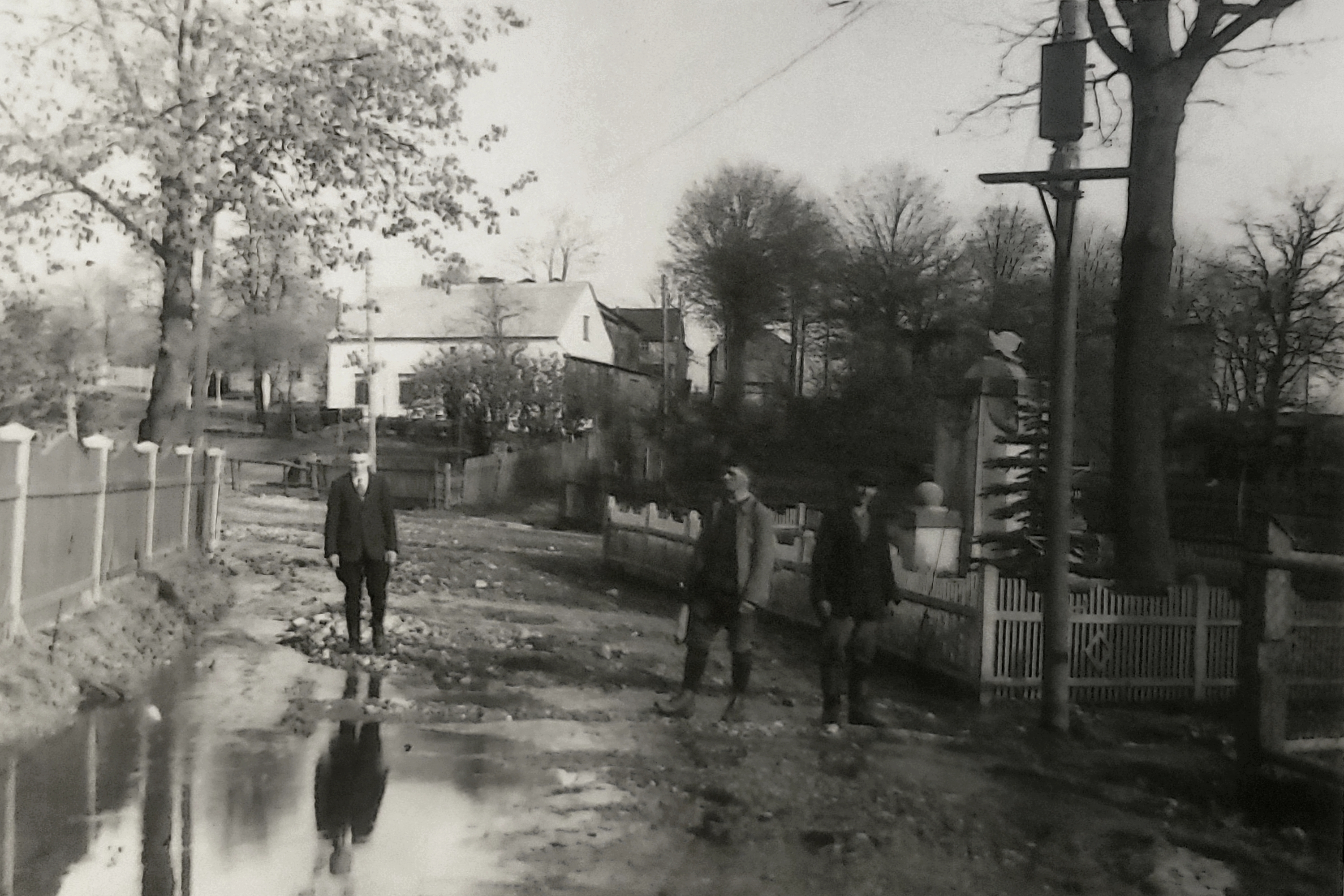 Nach dem Unwetter im Mai 1935 liegt Geröll auf der Straße am Kriegerdenkmal. Drei Männer besichtigen den Schaden.