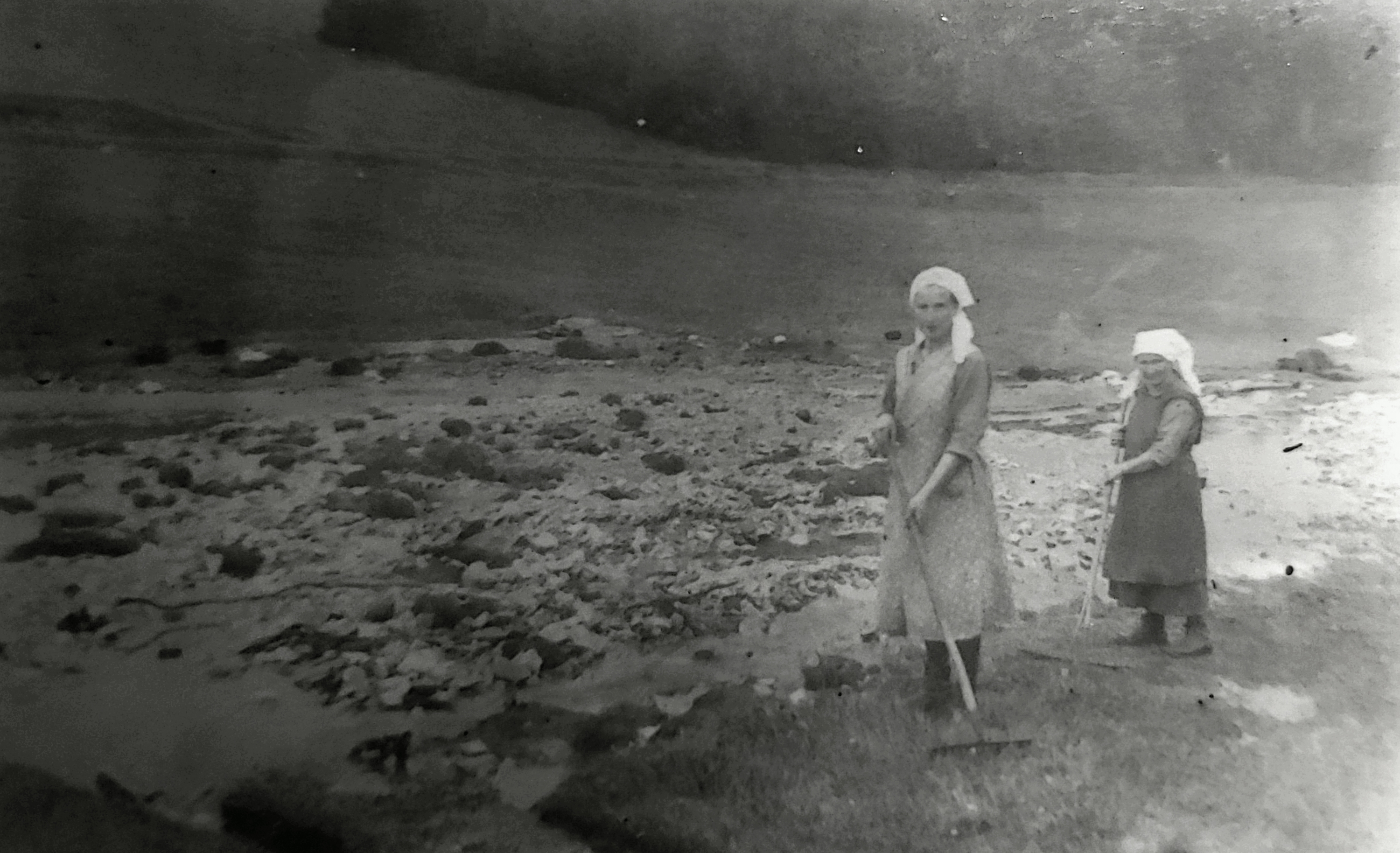 Zwei Frauen mit Kopftüchern und Schürzen beräumen eine Weide von Geröll, welches das Unwetter mitgerissen hatte.